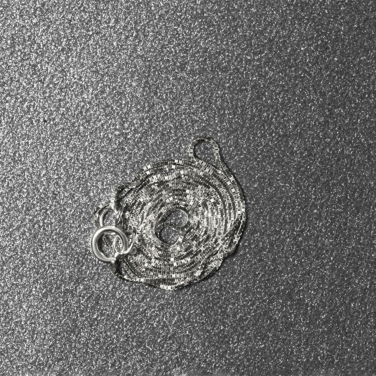 This classic box chain comes in 14k white gold and has a width of 0.45 millimeters.