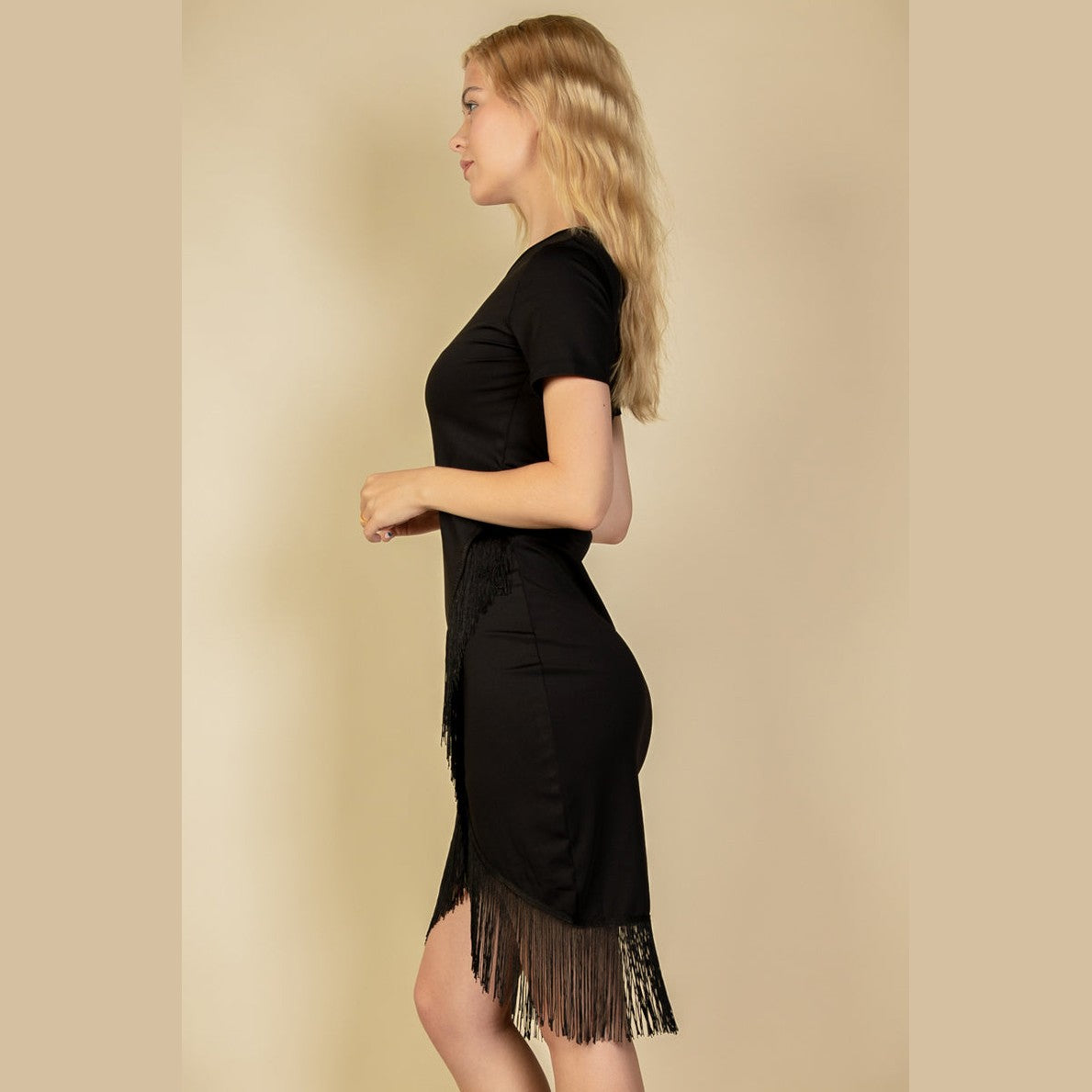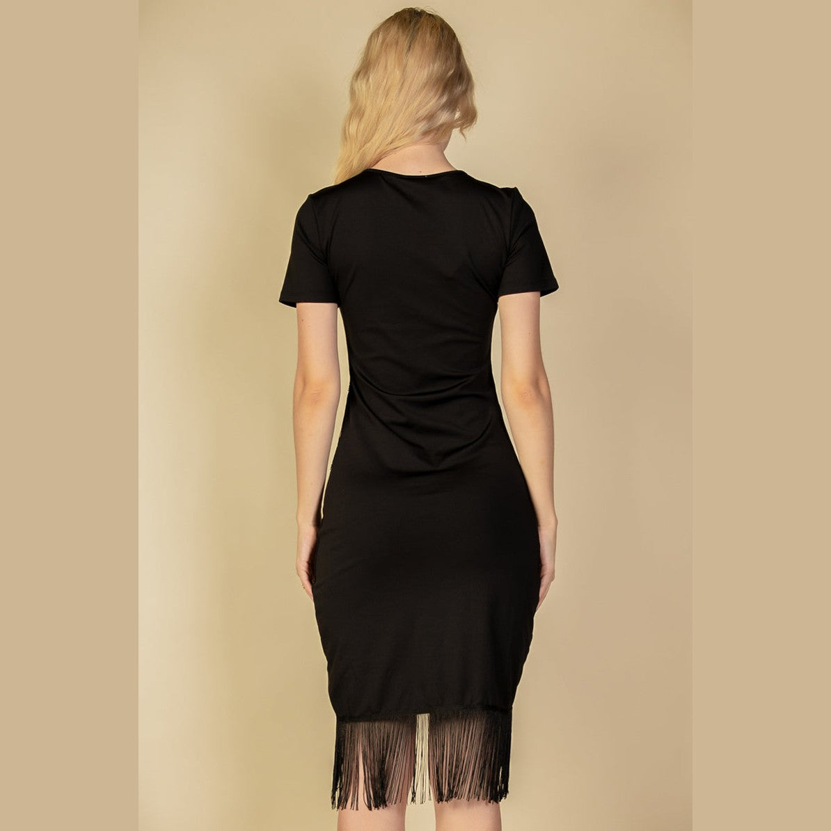 Fringe Hem Short Sleeve Bodycon Midi Pencil Dress