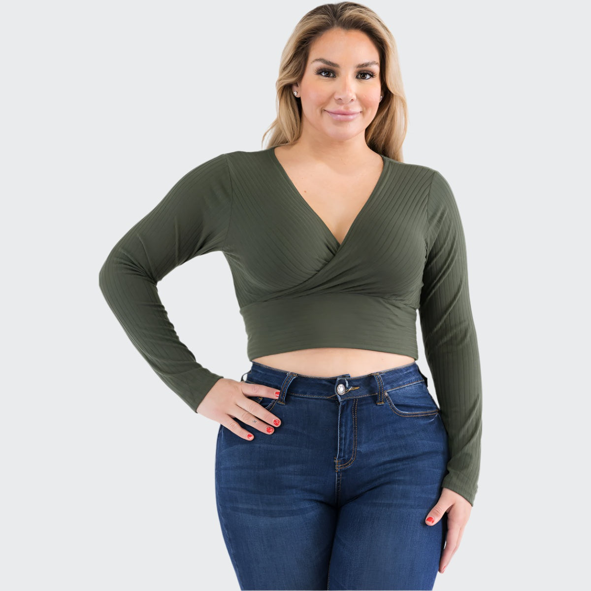 plus size wrap top, ribbed plus size blouse, deep V-neck plus top, long sleeve crop top, curve-hugging top, trendy plus size fashion, stretchy ribbed knit, casual chic, evening wear, statement crop top