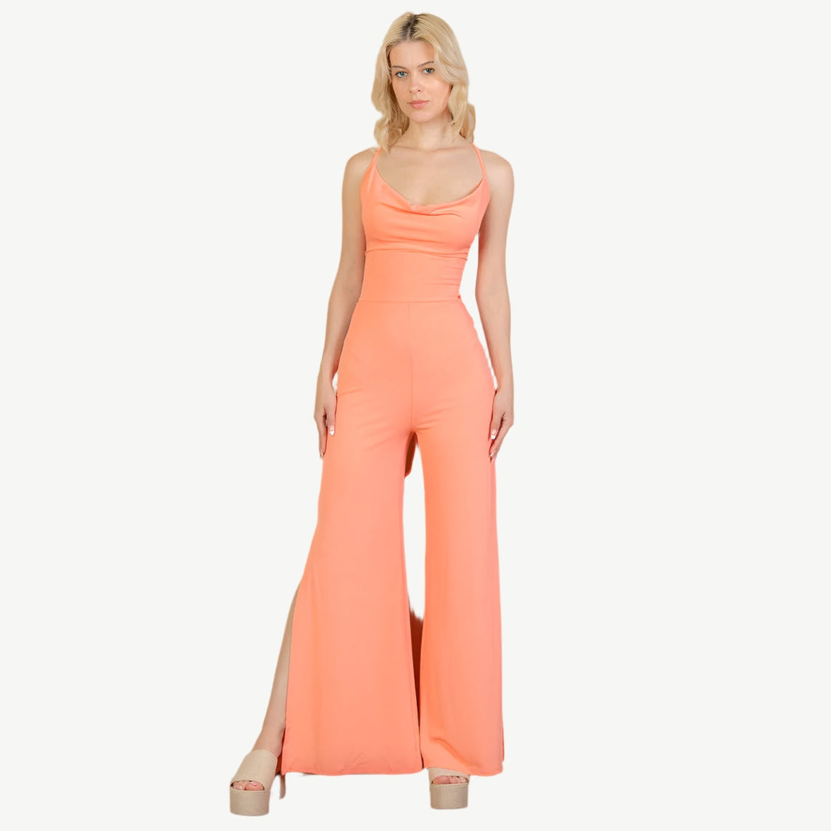 Make an unforgettable entrance in this effortlessly chic wide-leg jumpsuit. Designed with a draped cowl neckline and a daring open back featuring crisscross lace-up details, this piece exudes elegance with a touch of allure. The high-waisted fit accentuates your curves, while the flowy split-leg design adds movement and a subtle sultry edge. Whether paired with heels for an upscale event or dressed down with sandals for a laid-back vibe, this jumpsuit is a must-have for any fashion-forward wardrobe.