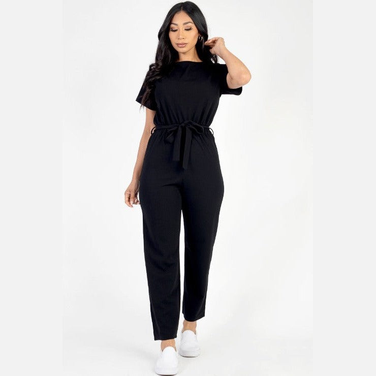 tie waist jumpsuit, relaxed fit jumpsuit, wide-leg jumpsuit, casual jumpsuit, comfortable one-piece, effortless style, women's jumpsuit