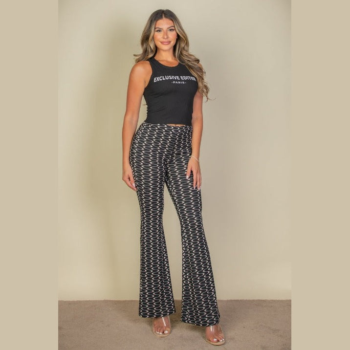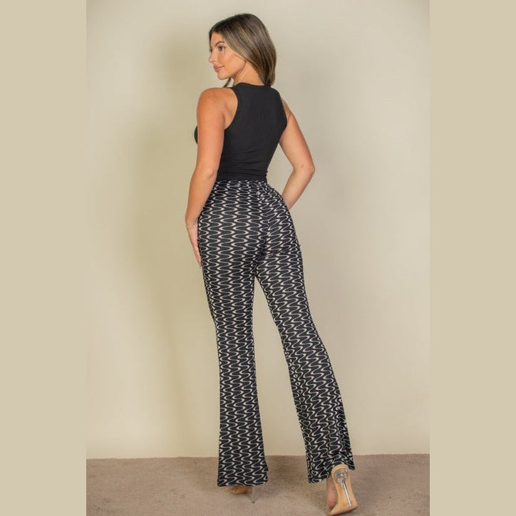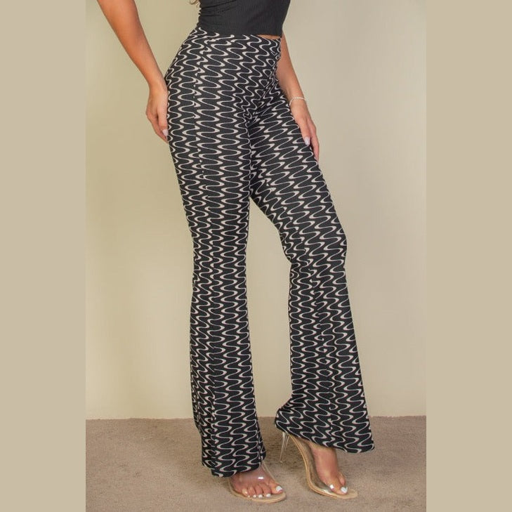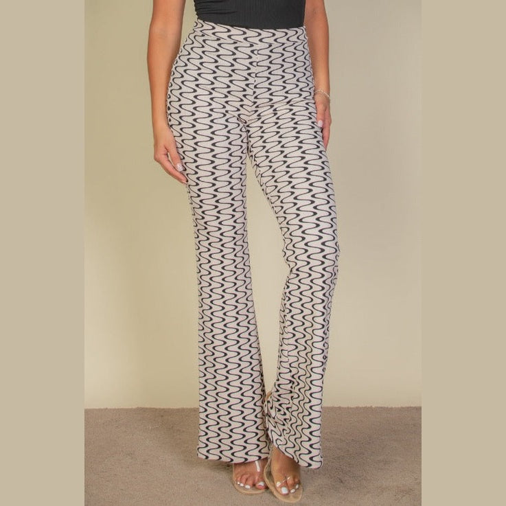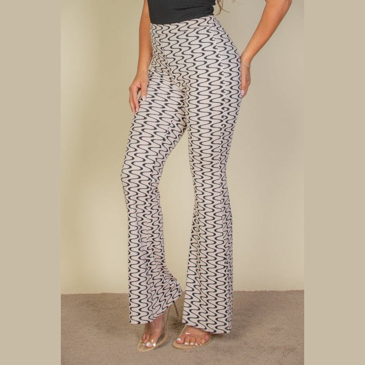 Bring retro vibes to your wardrobe with these high-waisted flare pants featuring a bold wavy print. The figure-hugging fit through the thighs flares out for an elongating effect, making these perfect for both casual and statement styling. Pair them with a fitted top and heels for a fashion-forward look.